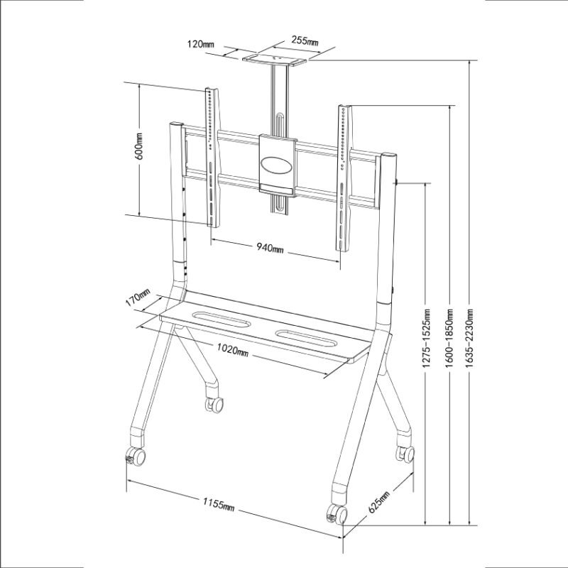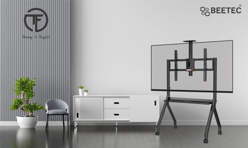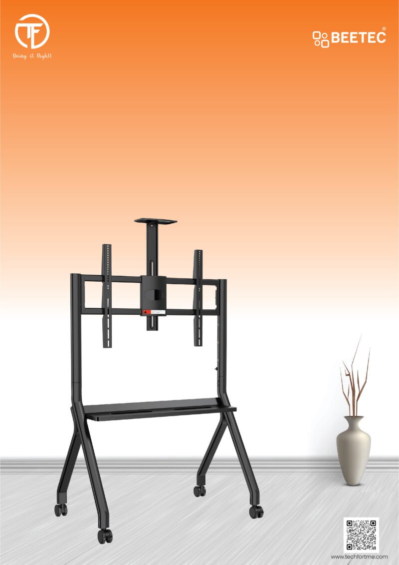 This heavy-duty mobile TV stand is designed to support large displays ranging from 55 to 100 inches. With a robust structure capable of handling up to 120 kg, it is ideal for conference rooms, classrooms, and exhibitions. The stand includes a wide VESA mounting compatibility of up to 900×600mm, ensuring versatility with various screen types. Smooth-rolling wheels and a stable frame provide both mobility and safety.