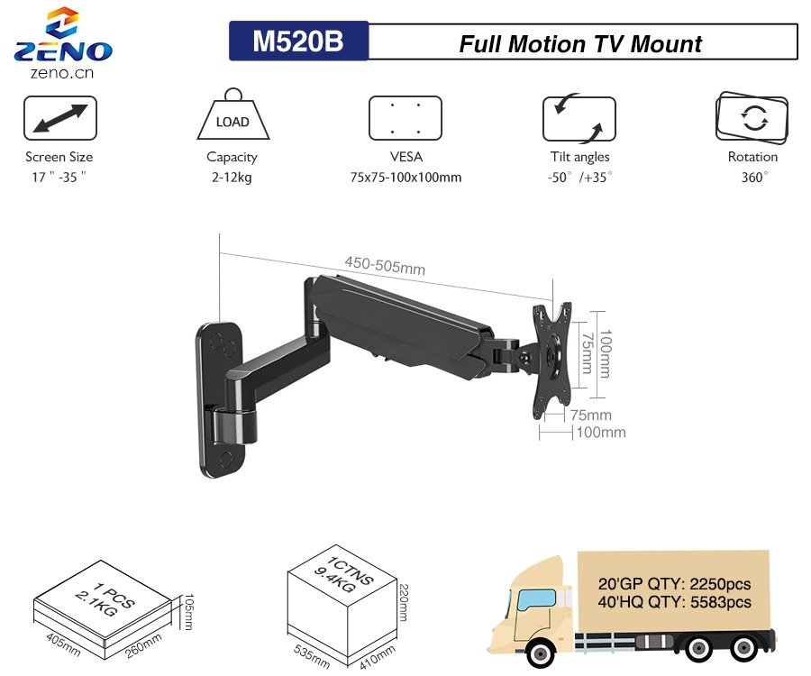 The KLC M520 Full Motion TV Mount is a versatile and durable mounting solution designed for 17″–35″ screens, offering smooth adjustability and strong support for devices up to 12 kg. Its extendable dual-arm structure provides a reach of 450–505 mm, allowing precise positioning for workspaces, home setups, and commercial displays. With flexible tilt control, 360° rotation, and universal VESA compatibility (75×75 mm / 100×100 mm), this mount ensures an optimal viewing experience from any angle. Built with high-quality materials and engineered for stability, the KLC M520 delivers reliability, ease of installation, and long-lasting performance.