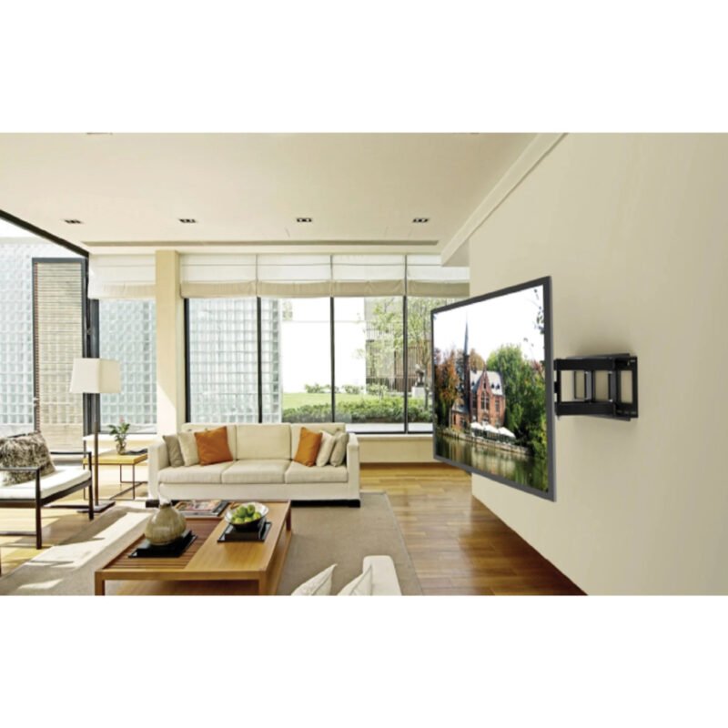 The new solid large full motion mount is constructed with high gauge steel that designed for most 37″-90″ flat panel TVs up to 65kg/143lbs. This mount allows you to have your flat panel TV tilted for glare control or optimum viewing angle, pulled out from the wall (635mm extension) and angled towards a separate viewing area. This pre-assembled arm comes complete with integrated cable management and decorative covers to ensure an elegant and tidy look.
