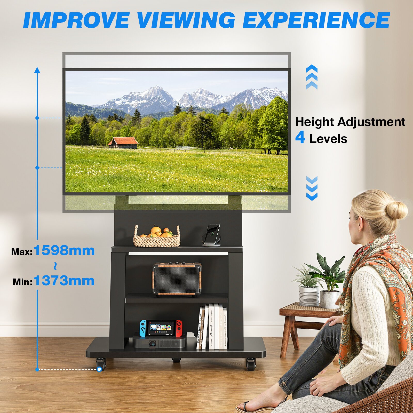 Customizable Viewing Heights: Features 4 levels of height adjustment, allowing you to set the TV center between 1373mm and 1598mm for an optimized viewing experience from any seat.