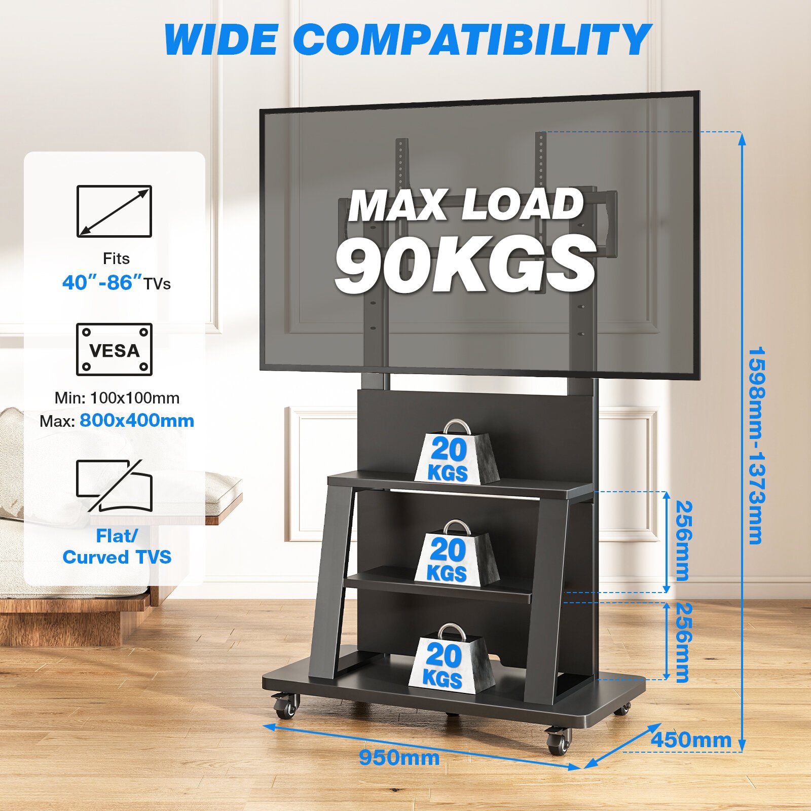 Superior Load Capacity: Engineered to support a maximum TV load of 90kg (approx. 198lbs), with three reinforced shelves each capable of holding 20kg of media equipment.