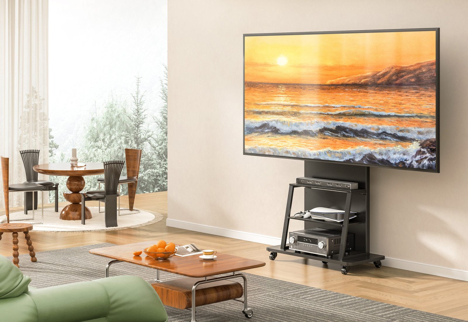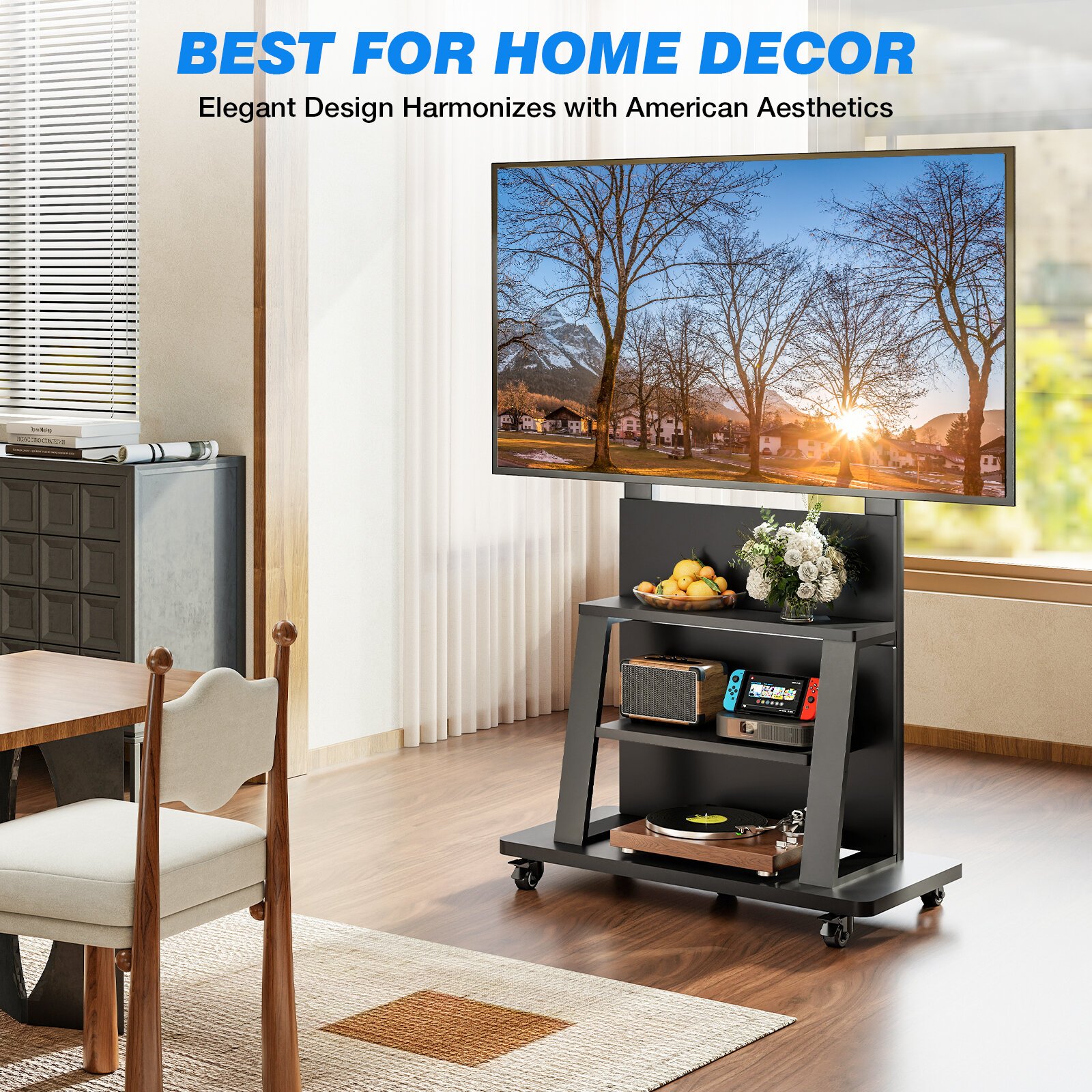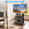 Transform your home entertainment with this all-in-one mobile media console. Combining an industrial-strength TV mount with an elegant three-tier shelving system, this stand is designed to harmonize with modern aesthetics while providing ultimate functionality. Whether you are gaming in the living room or hosting a movie night, the smooth-rolling casters and wide, stable base allow you to move your entire theater setup with ease.