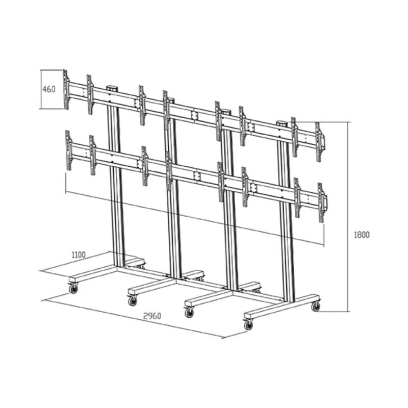 This heavy-duty mobile video wall stand is designed to support a 4×2 display configuration, making it perfect for commercial, corporate, and event applications. Built with a robust steel frame, it ensures stability and durability while holding multiple screens securely in place. The stand is equipped with lockable caster wheels, allowing smooth mobility and easy repositioning of the entire video wall setup. Its modular design makes installation and maintenance hassle-free, ensuring seamless alignment of all displays.