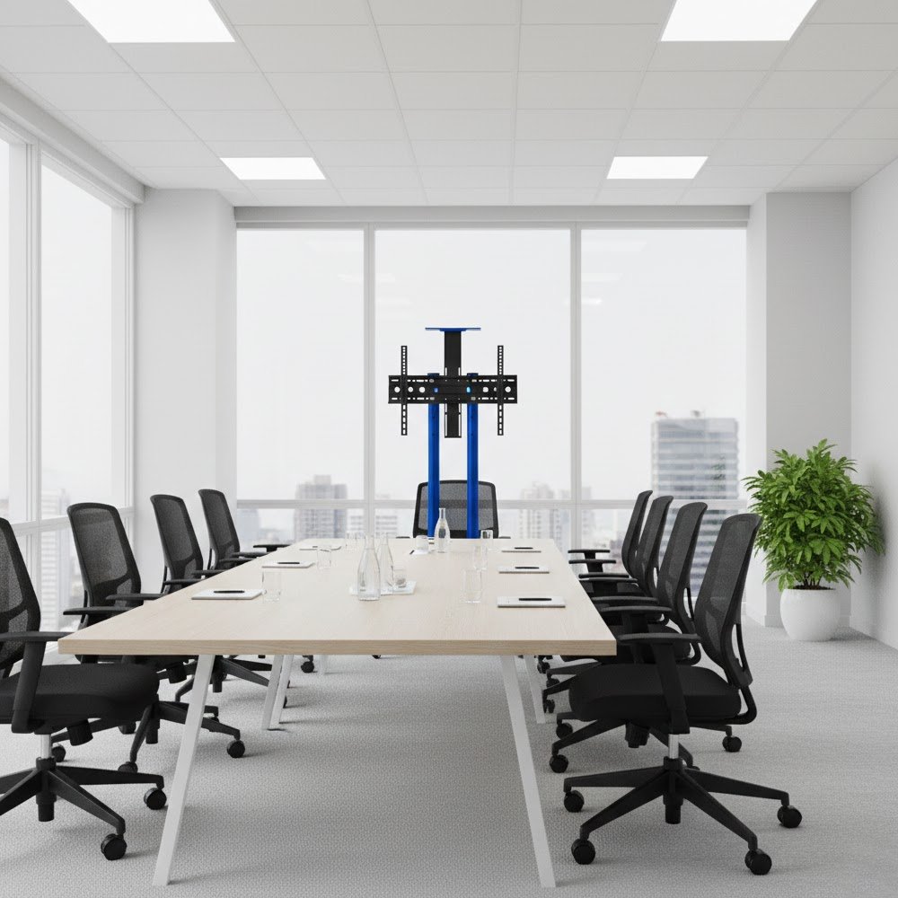 The BEETEC TF-T1500R is a rugged, height-adjustable mobile TV cart designed for meeting rooms, classrooms and public displays. It supports 32″–75″ flat screens (VESA 600×400), carries up to 50 kg and includes a tilt function, integrated AV shelf, cable management and lockable castors for safe, neat and mobile installations.